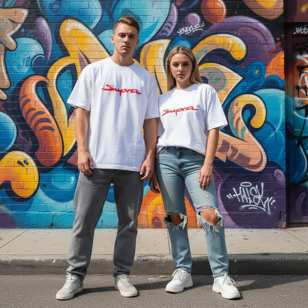 Fit: The Legend Drift Supra Snow‑White T‑shirt is crafted in a relaxed unisex oversized silhouette with dropped shoulders and extended hem — merging elevated streetwear design with everyday comfort.