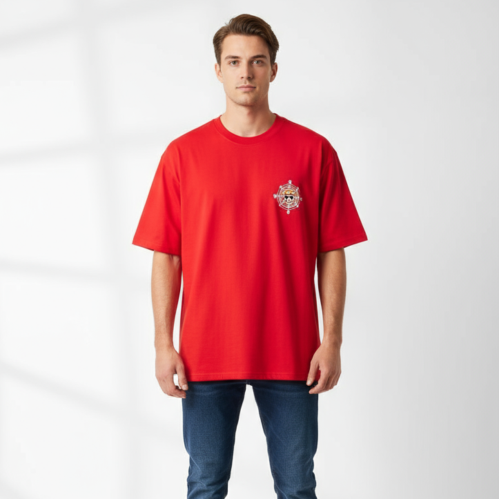 Fit: The Sunset Compass Tee LavaRed offers a striking unisex oversized fit with dropped shoulders and extended length, creating a bold streetwear silhouette that merges relaxed comfort with adventurous spirit.